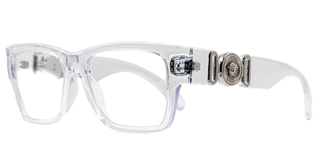 Lentes de sol VERSACE MOD 3368 U 148 55 17 140. En forma cuadrada rectangular, marco de pasta color traslucido, varillas gruesas de pasta color traslucido con diseño plateado en los laterales. Peso: 45.5 g