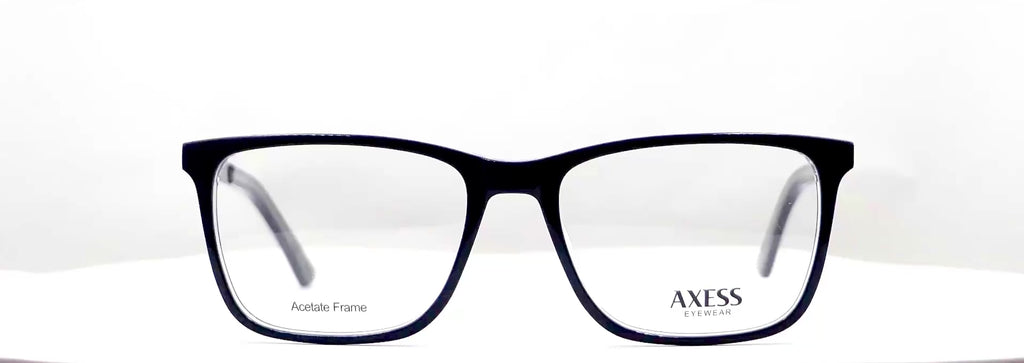 Lentes oftálmicos AXESS 5050NAVY 55 18 145 POM1. En forma cuadrada, marco de pasta color negro completo, varillas delgadas de metal color gris con terminacion en pasta color negro. Peso: 21.7 g