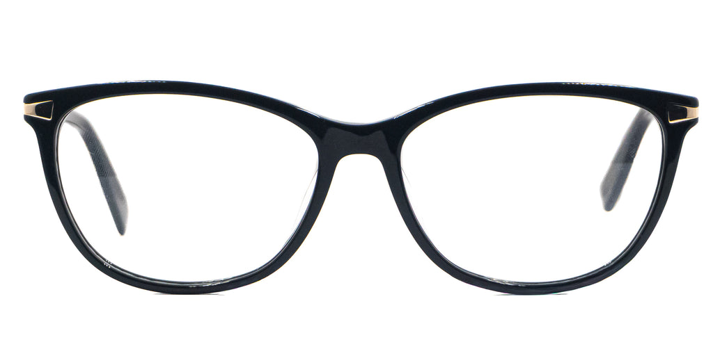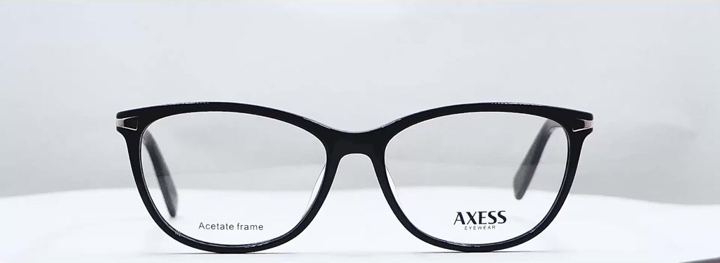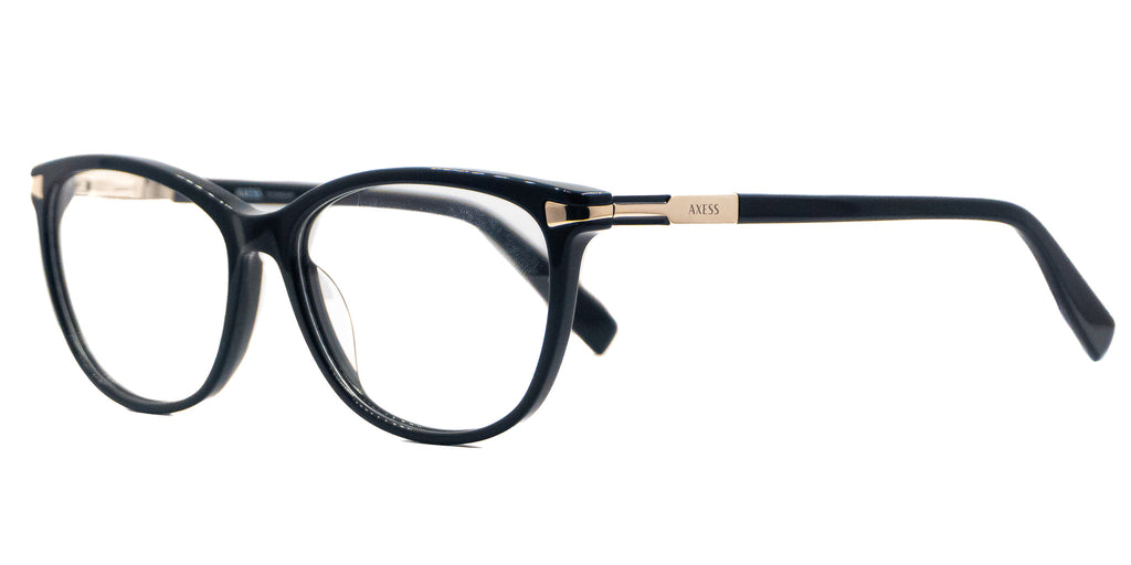 Lentes oftálmicos AXESS 5081 BLACK 53 16 135 POM8. En forma ovalada estilo cat eye, marco de pasta color negro completo, varillas delgadas de metal color dorado con terminacion en pasta color negro. Peso: 22.1 g