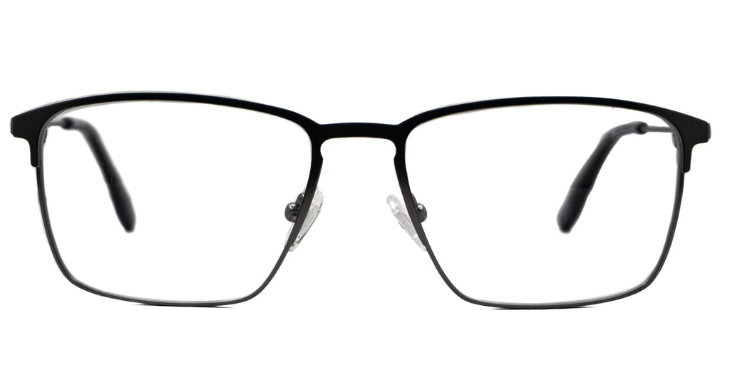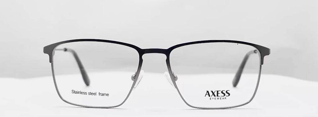 Lentes oftálmicos AXESS 5099M L GUN 55 17 140 POM1. En forma cuadrada, marco de metal color negro con gris, varillas delgadas de metal color gris con terminacion en pasta color negro. Peso: 22.1 g