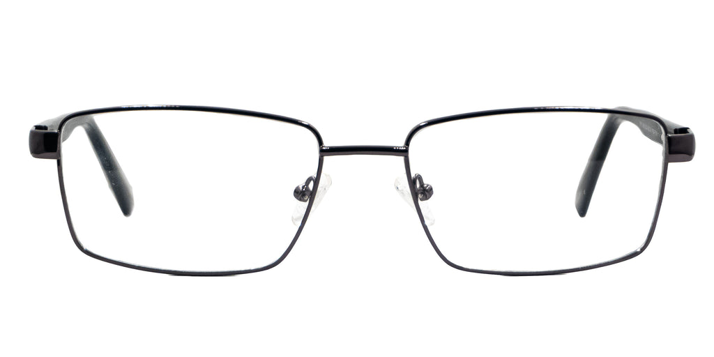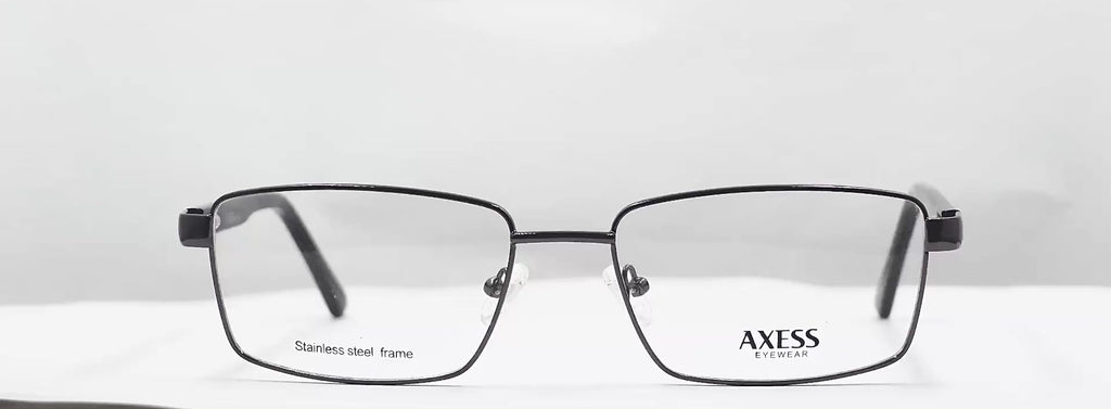 Lentes oftálmicos AXESS 6111 SHGUN 59 19 150 POM1. En forma rectangular, marco de metal color gris oscuro, varillas delgadas de pasta color gris traslucido. Peso: 26.5 g