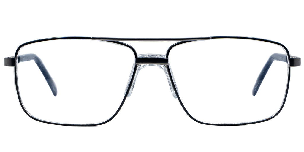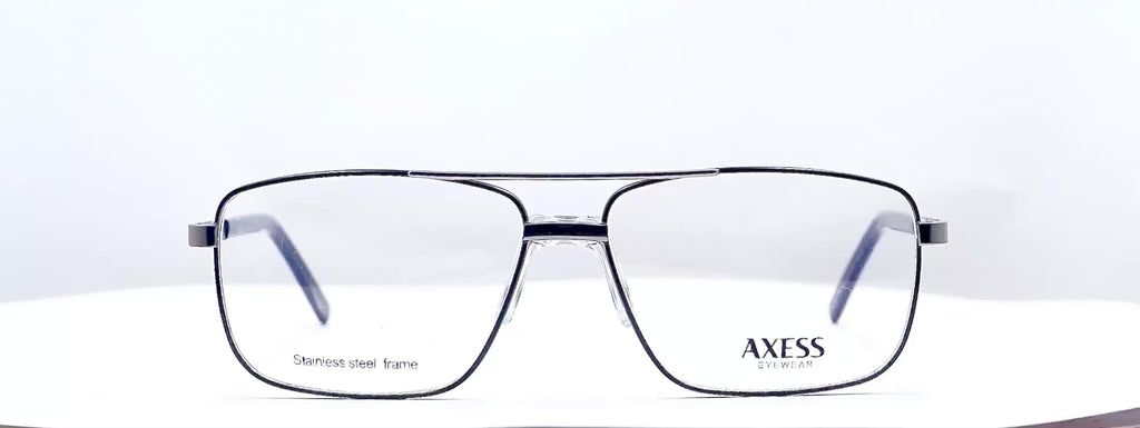 Lentes oftálmicos AXESS 6112 M L GUN 57 14 145 POM1. En forma rectangular tipo aviador, de metal color negro con plateado, varillas delgadas de metal color plateado oscuro con terminacion en pasta color azul. Peso: 23.9 g