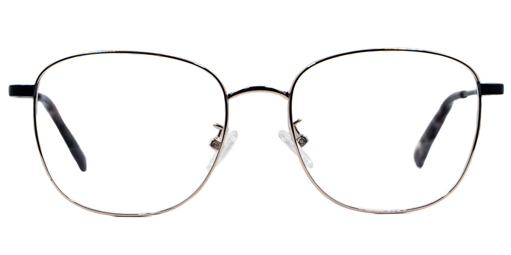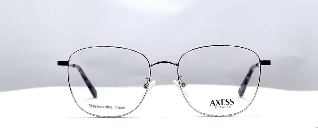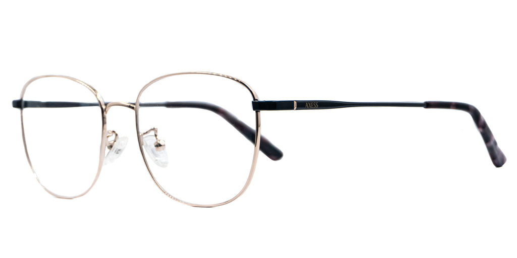 Lentes oftálmicos AXESS 6129 SH L GOLD 52 17 135 POM1. En forma ovalada, de metal color arena, varillas delgadas de pasta color cafe oscuro con terminacion en pasta color negro. Peso: 19.1 g