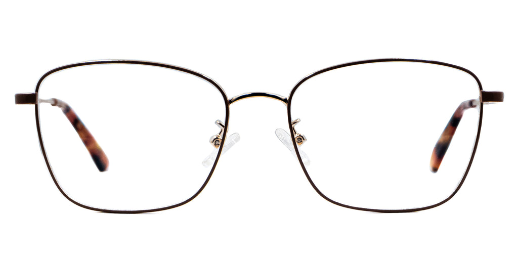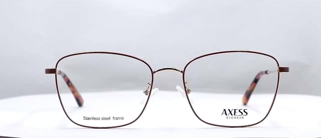 Lentes oftálmicos AXESS 6130 SH PINK 54 18 140 POM1. En forma cuadrada- trapezoide, de metal color dorado oscuro, varillas delgadas de metal color dorado con terminacion en pasta color cafe con negro carey. Peso: 20.3 g