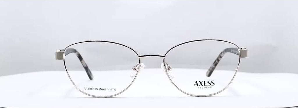 Lentes oftálmicos AXESS 6136 SH L GOLD BLACK 55 17 140 POM1. En forma ovalada tipo cat eye, de metal color arena, varillas delgadas de pasta color cafe con negro carey. Peso: 22.8 g