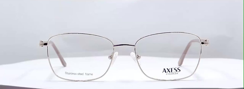 Lentes oftálmicos AXESS 6142 SH L GOLD 55 17 138 POM1. En forma rectangular, de metal color arena-dorado, varillas delgadas de pasta color cafe. Peso: 20.1 g