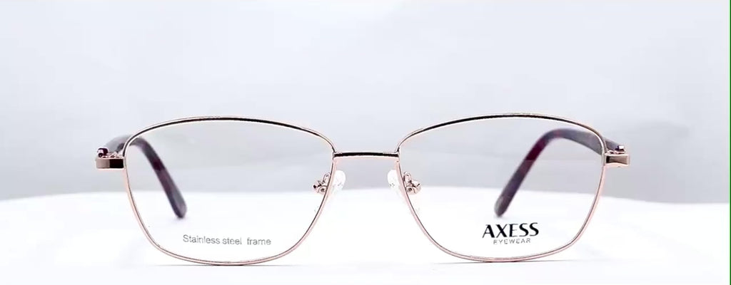 Lentes oftálmicos AXESS 6145 SH L PINKGOLD 55 16 140 POM1. En forma trapezoide, de metal color dorado, varillas delgadas de pasta color morado con vino carey. Peso: 21.4 g