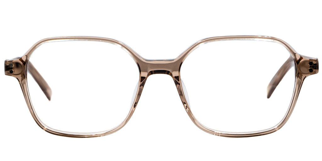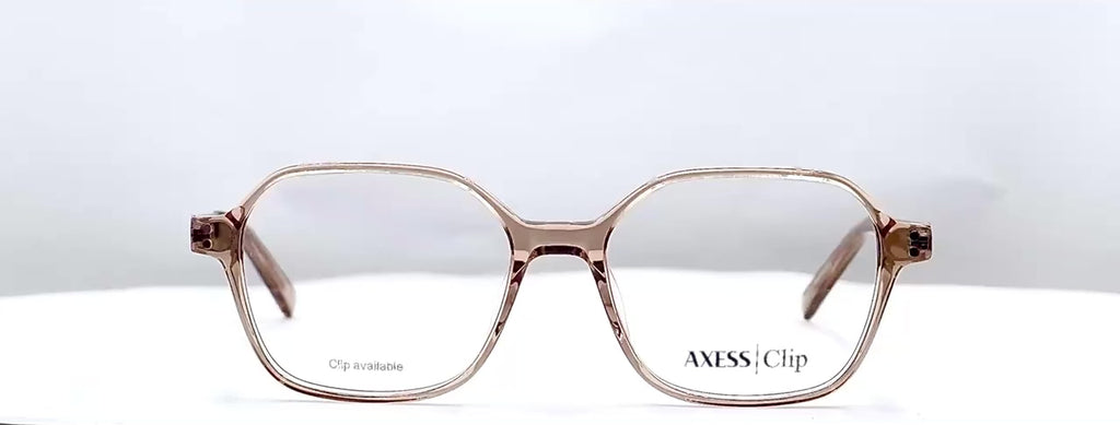 Lentes oftálmicos AXESS CLIP 2726 BROWN 54 17 145 POM7. En forma hexagonal, marco de pasta cafe traslucido, varillas delgadas de metal dorado mate terminacion en pasta café traslucido, con sobrepuesto cafe. Peso: 27.6 g