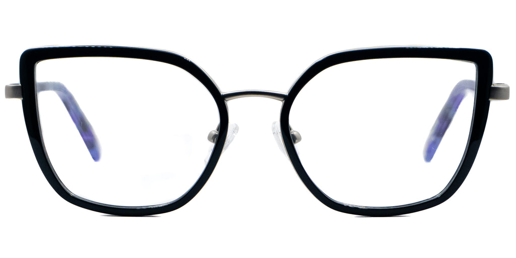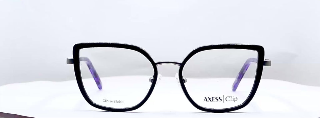 Lentes oftálmicos AXESS CLIP 2728 BLACK SILVER 54 18 145 POM7. En forma trapezoide estilo cat eye, marco de pasta con metal color negro, varillas delgadas de pasta carey lila con plateado con brillitos, con sobrepuesto negro. Peso: 36.4 g