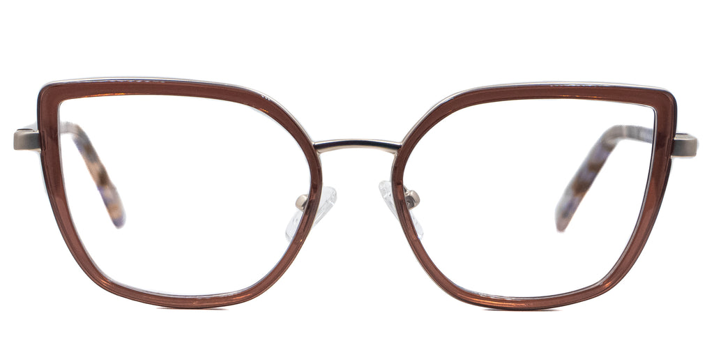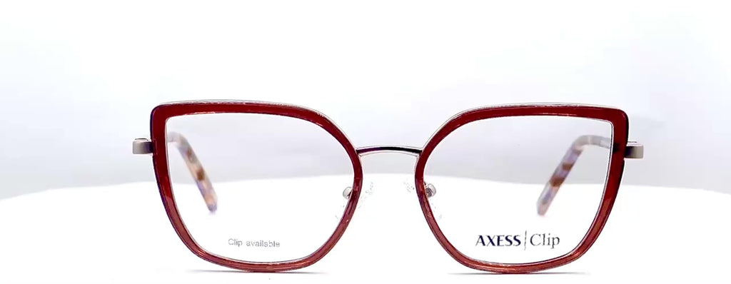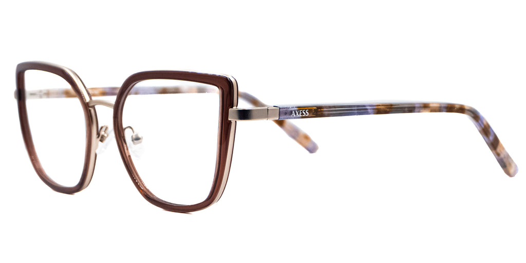 Lentes oftálmicos AXESS CLIP 2728 ROSY BROWN GOLD 54 18 145 POM7. En forma trapezoide estilo cat eye, marco de pasta con metal color cafe, varillas delgadas de pasta carey café con dorado brillitos, con sobrepuesto negro. Peso: 36.3 g