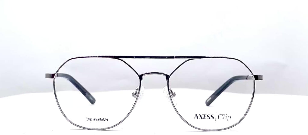 Lentes oftálmicos AXESS CLIP 3123 SH L GUN 55 17 140 POM2. En forma hexagonal tipo aviador, marco de metal color plateado, varillas delgadas de metal color plateado con terminacion en pasta negro, con sobrepuesto negro. Peso: 34.7 g