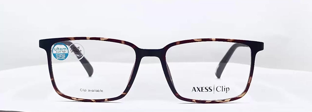 Lentes oftálmicos AXESS CLIP 6502 M DEMI 55 17 145 POM7. En forma rectangular, marco de pasta carey café con negro mate, varillas delgadas de pasta carey café con negro mate, con sobrepuesto negro. Peso: 22.2 g