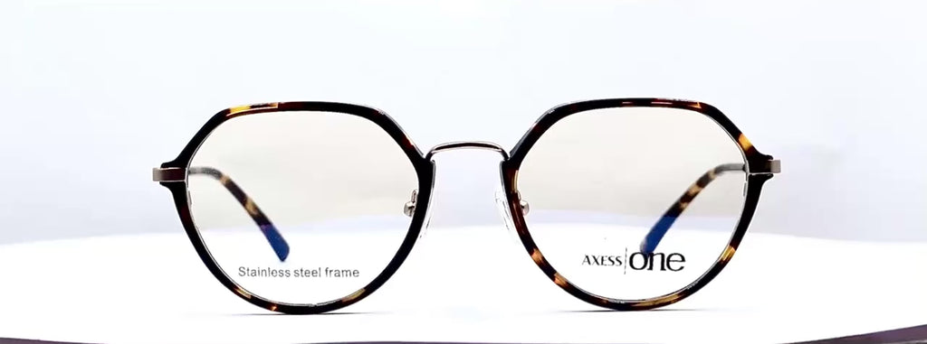 Lentes oftálmicos AXESS ONE 1027 MGOLD DEMI 53 19 140 POM6. En forma hexagonal, de pasta color negro con cafe carey, varillas delgadas de metal color dorado con terminacion en pasta color negro carey. Peso: 20.5 g