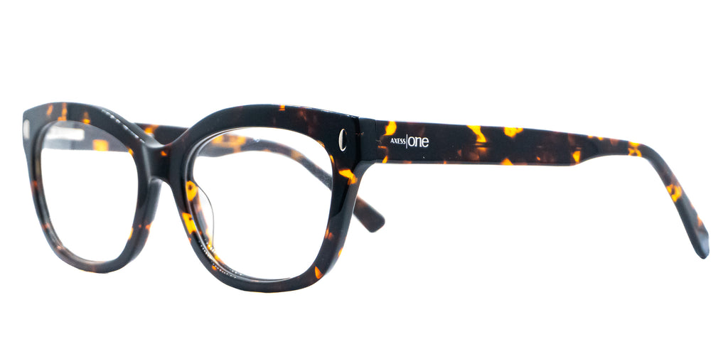Lentes oftálmicos AXESS ONE 1470 CAREY 54 19 145 POM1. En forma trapezoide tipo cat eye, de pasta color negro con cafe carey, varillas gruesas de pasta color negro con cafe carey. Peso: 21.4 g