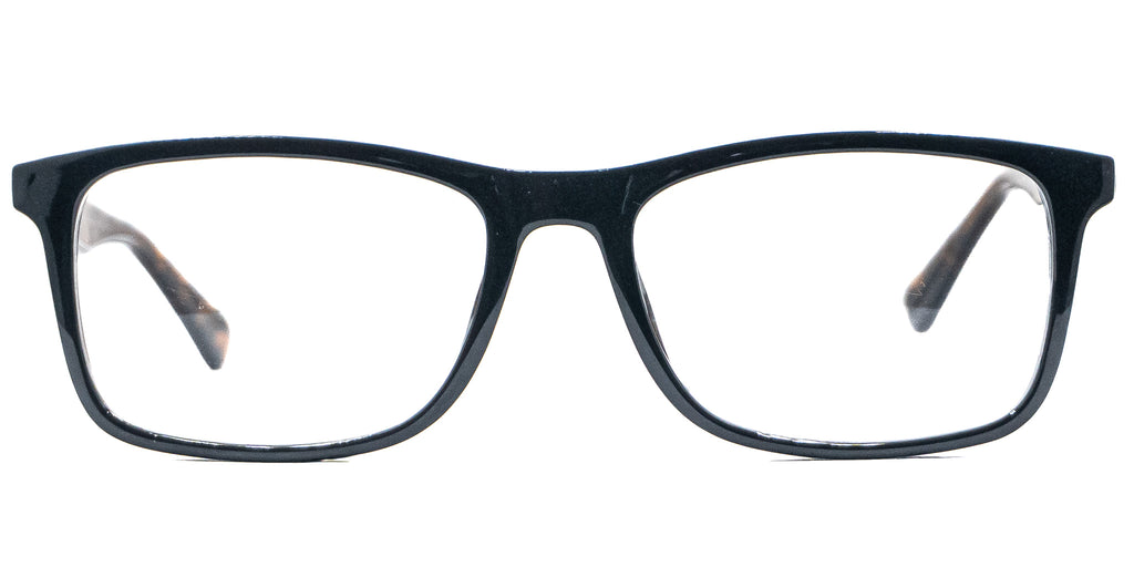 Lentes oftálmicos BRAVO 8428 BLACK DEMI 53 17 142 POM10. En forma cuadrada, lente de pasta color negro completo, varillas gruesas de pasta color cafe con negro carey. Peso: 21.4 g