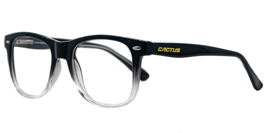 Lentes oftálmicos CACTUS P006 53 19 143 C3. En forma cuadrada, marco de pasta negro con transparente, varillas delgadas de pasta color negro. Peso: 27.6 g