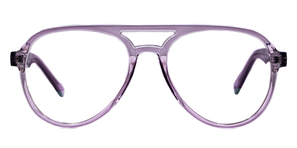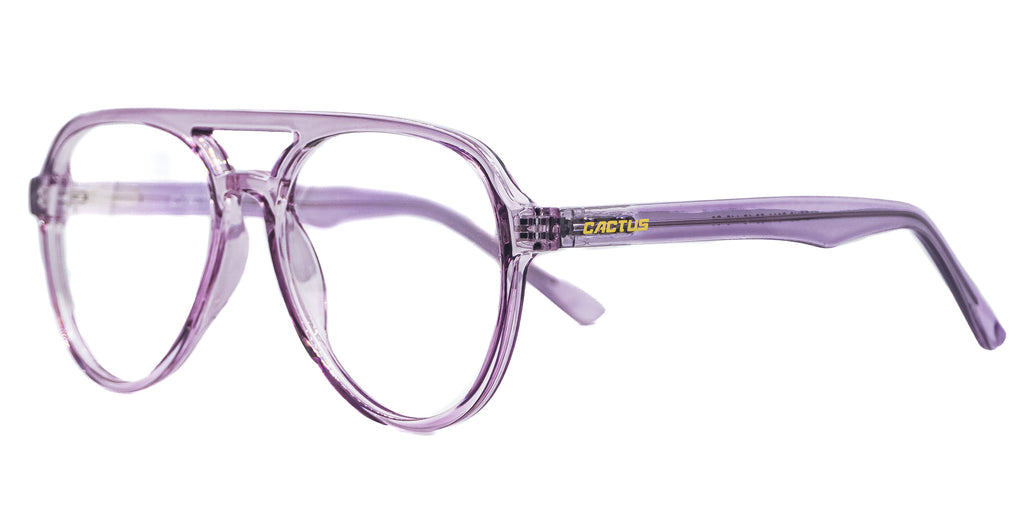 Lentes oftálmicos CACTUS P011 55 18 145 C6. En forma ovalada tipo aviador, marco de pasta color lila traslucido, varillas delgadas de pasta color lila traslucido. Peso: 23.9 g