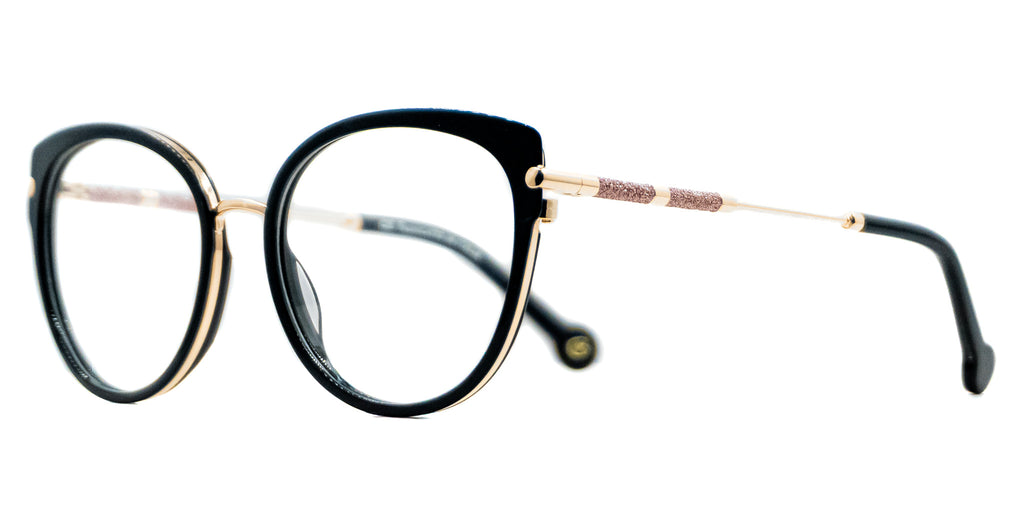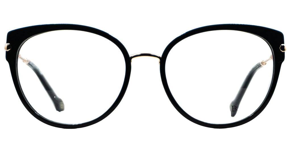 Lentes Oftalmicos CHRISTIAN BACH CBJ 3032 BLACK 54 18 140. En forma circular, marco de pasta color negro estilo cateye, varillas delgadas de metal color dorado con brillo, terminacion en pasta color negro. Peso: 26.1 g