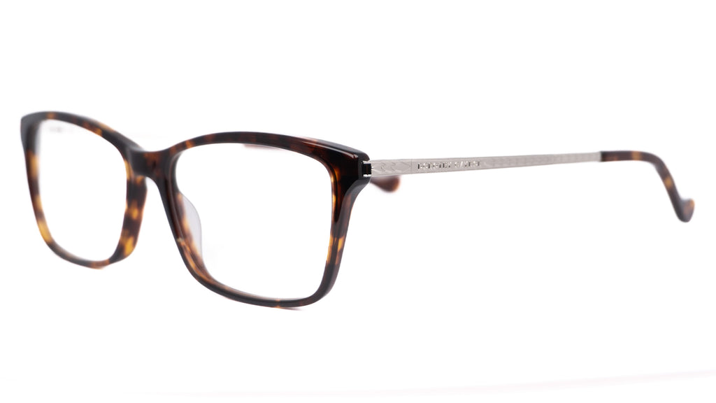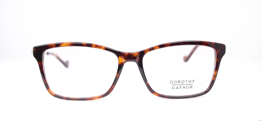 Lentes oftálmicos DOROTHY GAYNOR VDY.A21010DMI55 en forma cuadrada/ rectangular. Marco de pasta cafe estilo carey. Varillas delgadas de metal plateado con puntas color cafe en estilo carey. Peso: 21.5 g