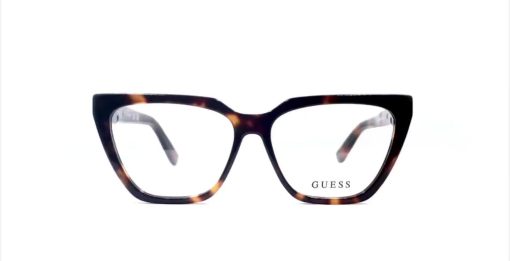 Lentes oftálmicos GUESS GU2985 052 54 14 145. En forma trapezoide tipo cateye, marco de pasta color negro con café carey, varillas gruesas de pasta color café con negro carey con adorno dorado en laterales. Peso: 33.2 g