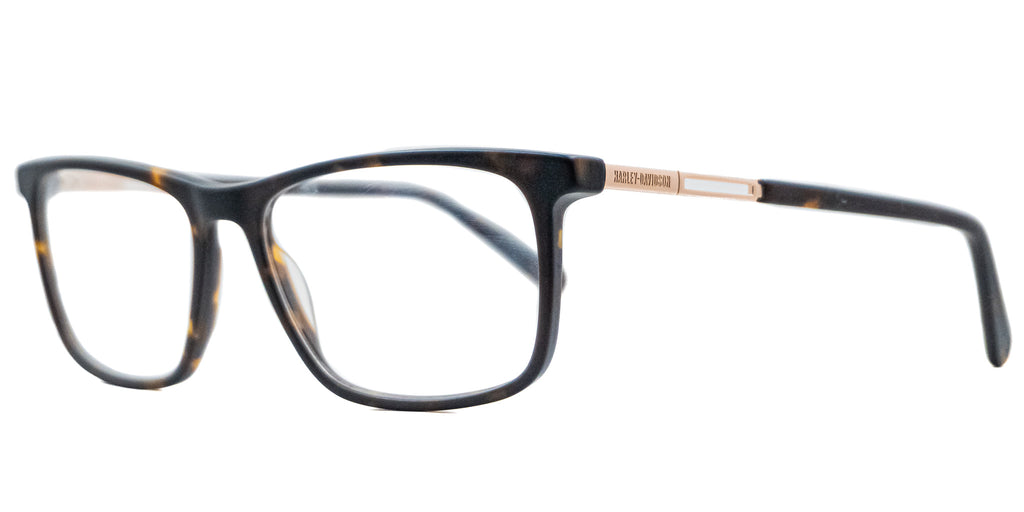 Lentes Oftalmicos HARLEY-DAVIDSON HD0886 052 56 16 145. En forma cuadrada, marco de pasta color negro con café carey mate, varillas delgadas de metal color dorado con terminacion en pasta negro con café carey mate. Peso: 22.6 g