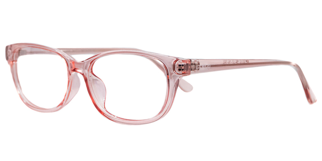Lentes oftálmicos INDIGO MP2010 54 37 16 140. En forma ovalada rectangular, marco de pasta color rosa traslucido, varillas delgadas de pasta color rosa traslucido. Peso: 18.5 g