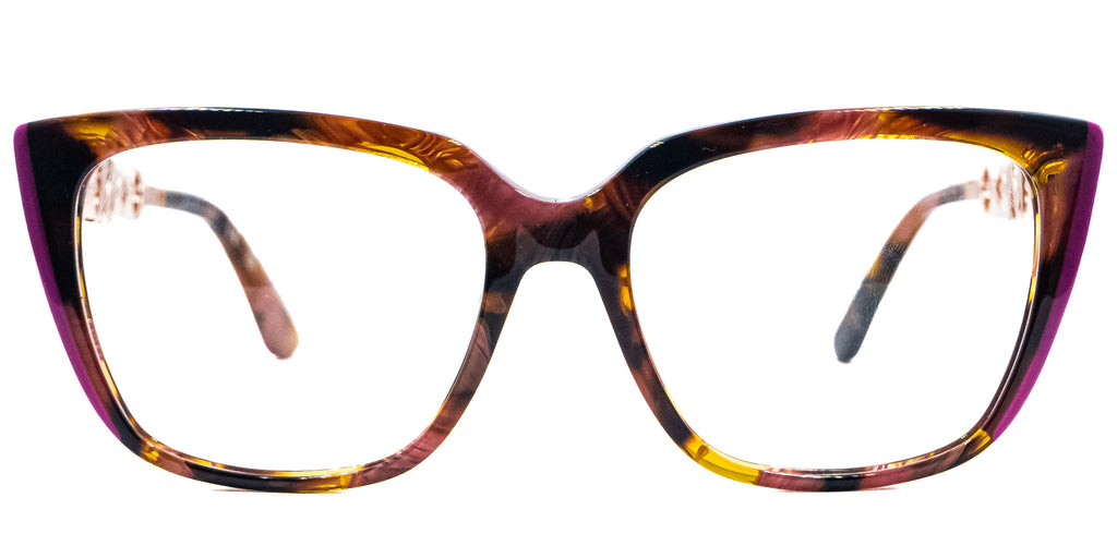 Lentes Oftalmicos MARCIANO GM50007 083 54 17 145. En forma cuadrada- cat eye, marco de pasta color morado con café carey, varillas delgadas de metal color dorado con terminacion en pasta morado con café carey. Peso: 30.1 g