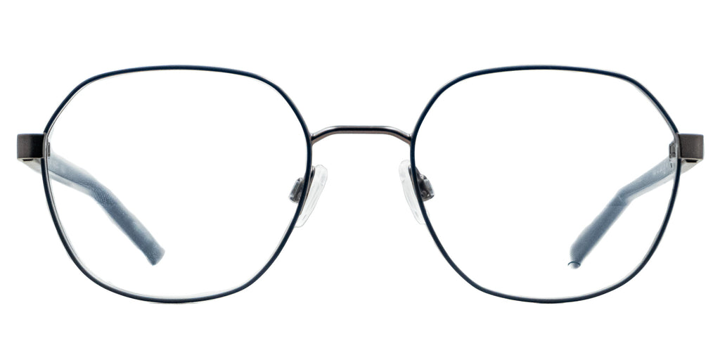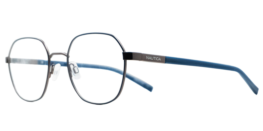 Lentes Oftalmicos NAUTICA N7342 420 52 20 145. En forma hexagonal, marco de metal gris oscuro, varillas delgadas de metal gris con terminación en pasta color azul marino. Peso: 24.6 g