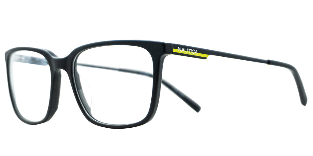 Lentes Oftalmicos NAUTICA N8173 005 56 18 145. En forma cuadrada, marco de pasta negro mate, varillas delgadas de metal color negro con verde limon, terminacion en pasta negro. Peso: 22.3 g