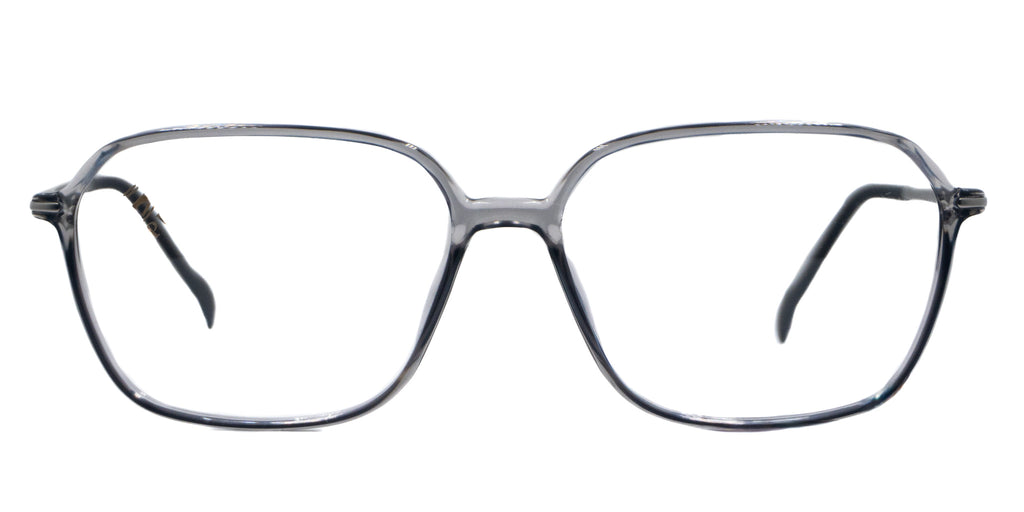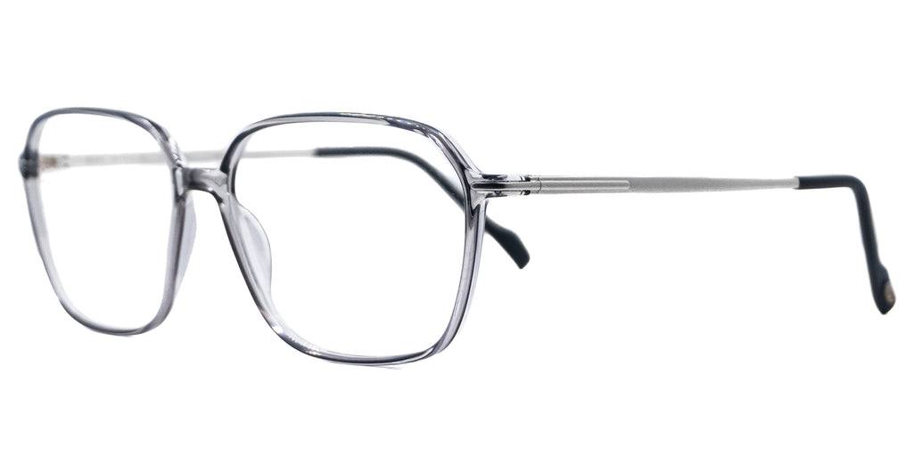 Lentes oftálmicos STEPPER 135 SI 20130 F220 55 14 TITANIUM. En forma haxagonal, marco de pasta color gris traslucido, varillas delgadas de metal color plateado con terminacion en pasta color negro. Peso: 12.3 g