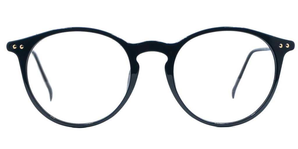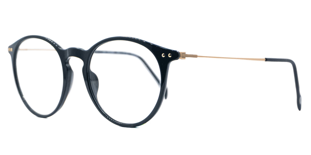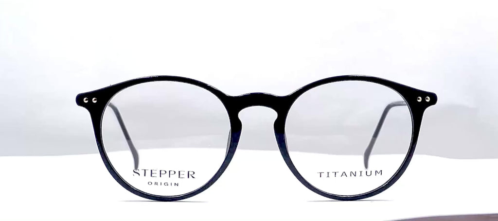 Lentes oftálmicos STEPPER 140 SI 45006 F910 51 19 TITANIUM. En forma circular, marco de pasta color negro completo, varillas delgadas de metal color dorado con terminacion en pasta color negro. Peso: 11.4 g
