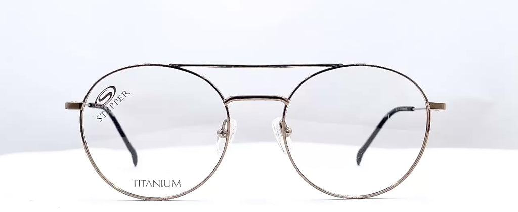 Lentes oftálmicos STEPPER 140 SI 60221 F010 54 20 TITANIUM. En forma circular, marco de metal color dorado, varillas delgadas de metal color dorado con terminacion en pasta color negro. Peso: 12.1 g