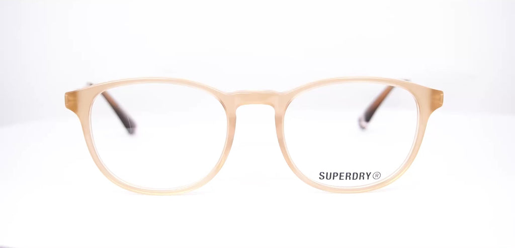 Lentes oftálmicos SUPERDRY K01 SDO OLSONM C103 51 19 140 en forma cuadrada/ circular tipo panthos. Marco de pasta color beige/ arena traslúcido. Varillas delgadas de metal color dorado con terminación de pasta color marron traslucido estilo carey. Peso: 32.4 g