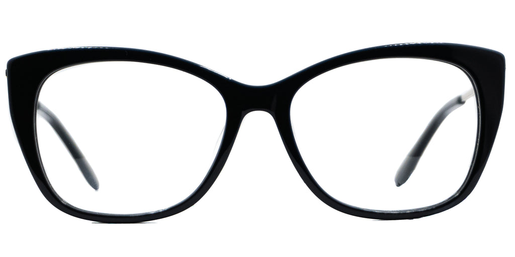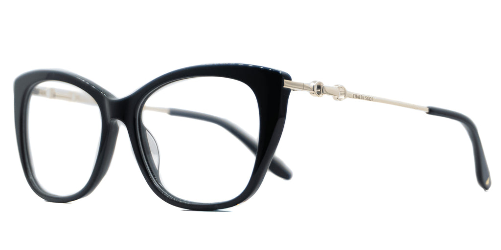 Lentes Oftalmicos THALIA SODI VTL 22119 0BLK 54. En forma cuadrada tipo cat eye, marco de pasta color negro completo, varillas delgadas de metal color dorado terminacion en pasta color negro. Peso: 18.8 g