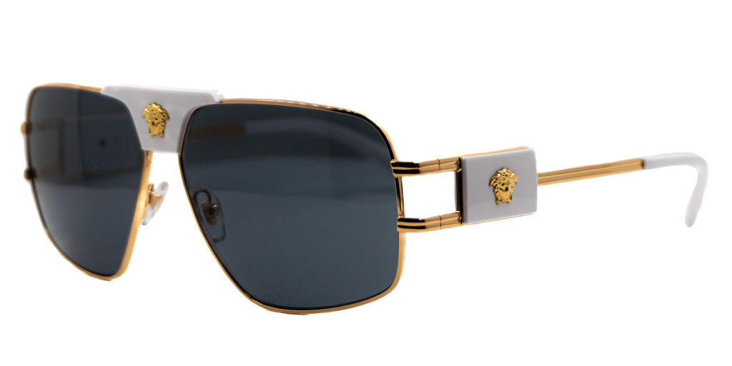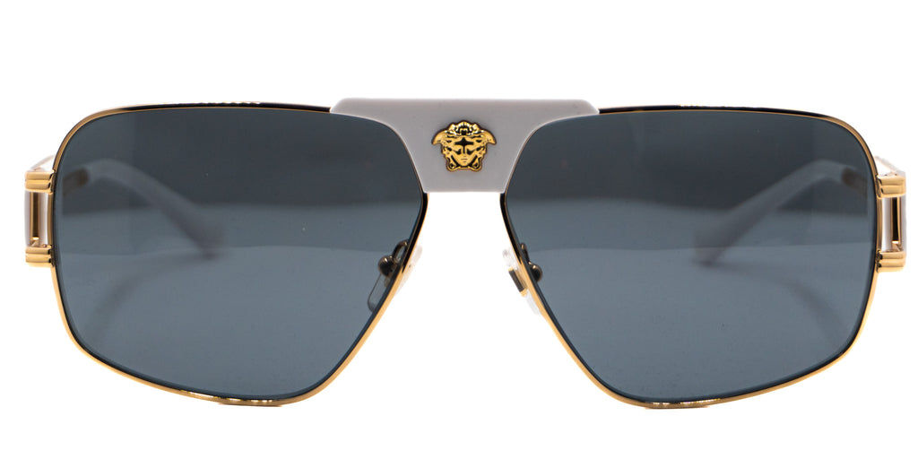 Lentes de sol VERSACE MOD 2251 1471 87 63 12 145 3N. En forma cuadrada tipo aviador, marco de metal color dorado, varillas delgadas de metal color dorado con adorno en los laterales. Peso: 38.6 g
