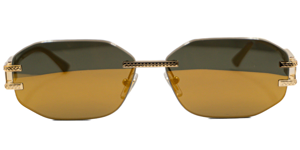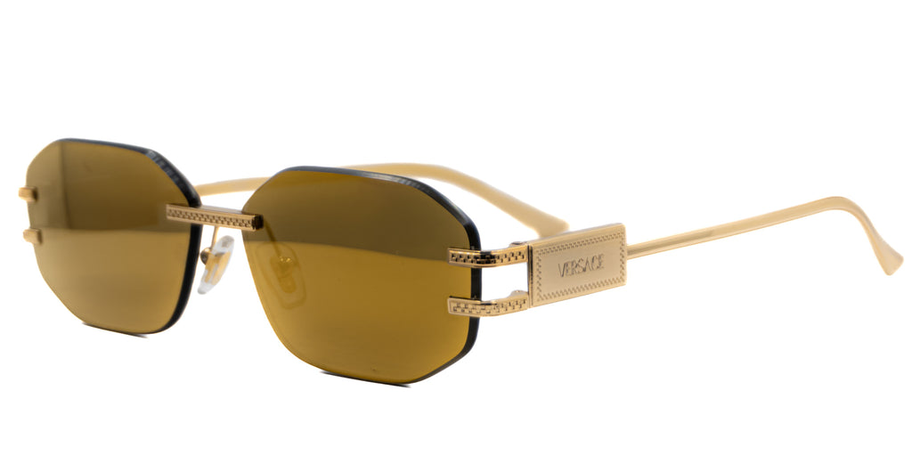 Lentes de sol VERSACE MOD 2274 1002 7P 58 13 140 3N. En forma ovalada hexagonal, marco de metal color dorado, varillas delgadas de metal color dorado con adorno en los laterales. Peso: 42.2 g