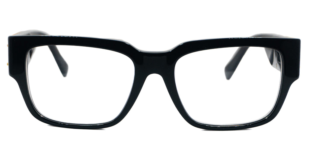 Lentes oftálmicos VERSACE MOD 3350 GB1 55 18 140. En forma cuadrada rectangular, marco de pasta color negro completo, varillas gruesas de pasta color negro con adorno dorado en los laterales. Peso: 58.3 g