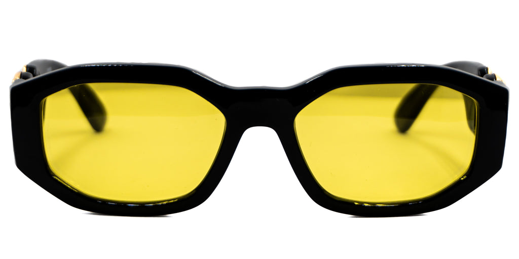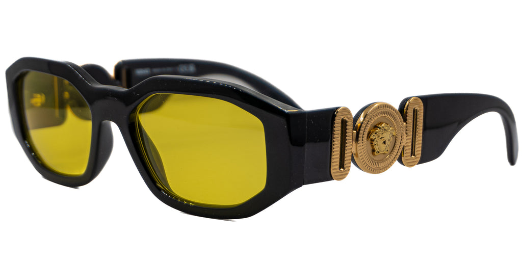 Lentes de sol VERSACE MOD 4361 GB1 85 53 18 140 0N. En forma cuadrada hexagonal, marco de pasta color negro completo, varillas gruesas de pasta color negro con adorno dorado en los laterales. Peso: 51.2 g