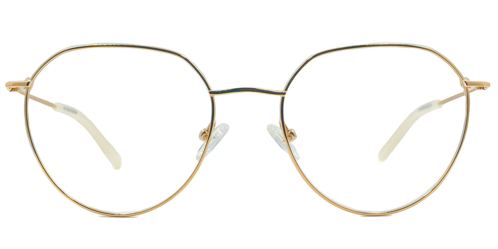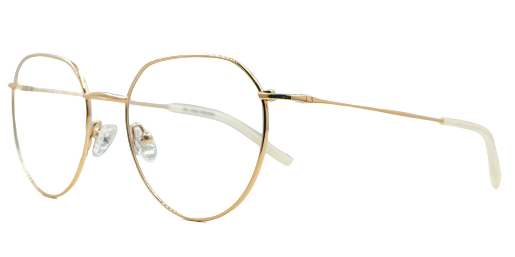 Lentes Oftalmicos VX TITANIUM VVX 00016 0WHT 55. En forma cuadrada de angulos redondeados, marco de metal color dorado con varillas delgadas de metal color dorado con terminacion en pasta color blanco perlado. Peso: 14.4 g